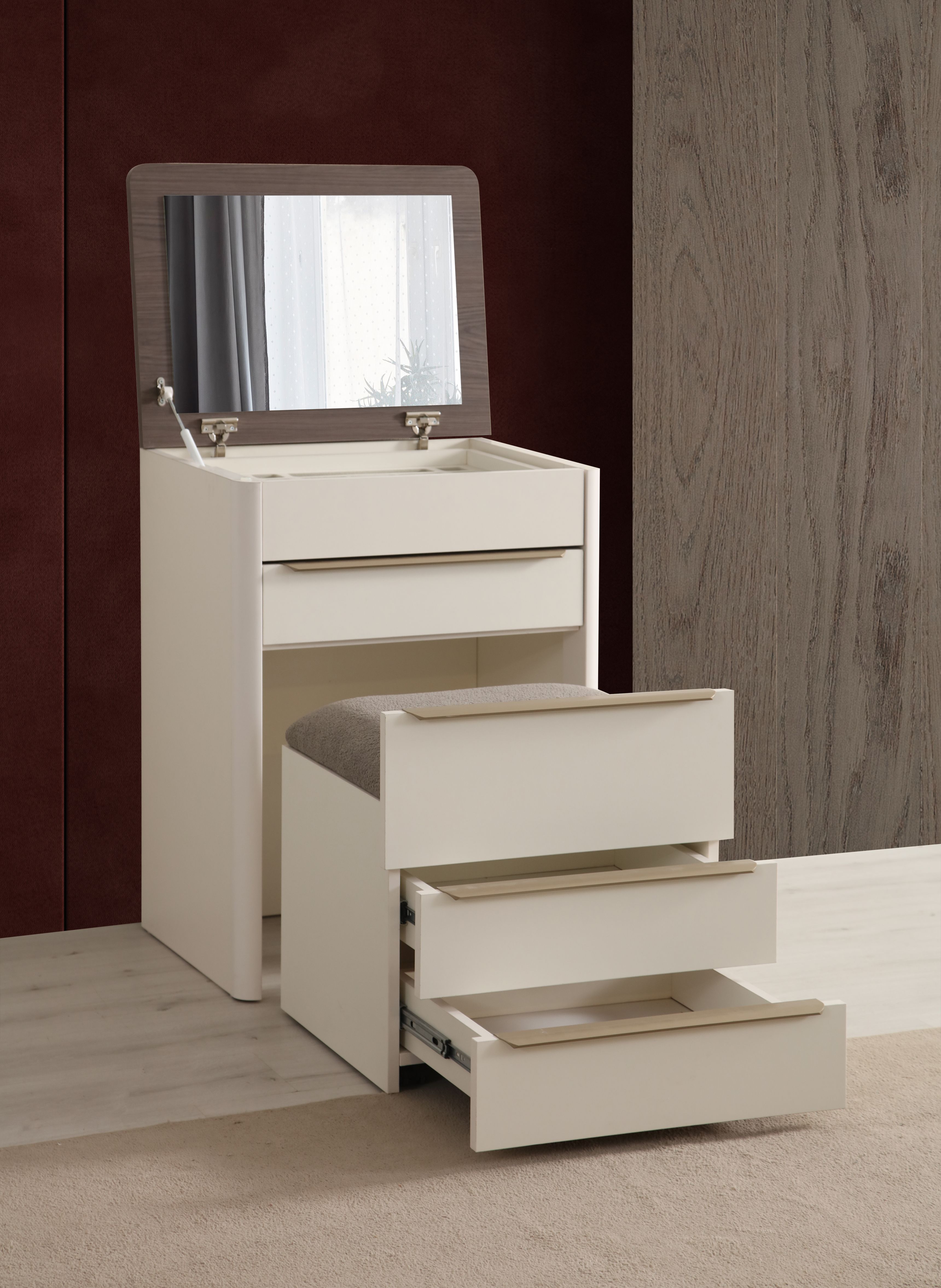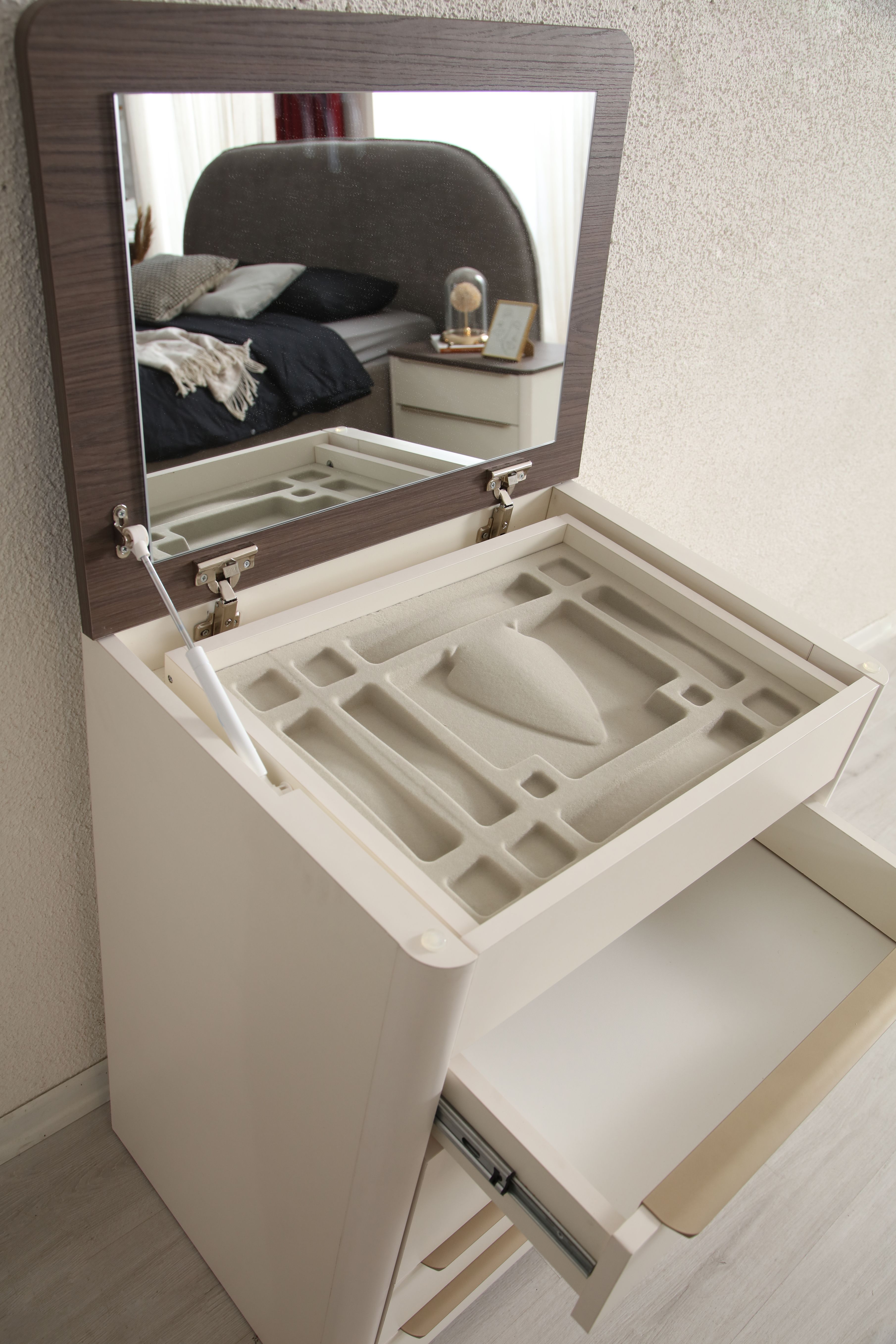 This makeup table, which combines aesthetics and functionality, is designed in a modern and elegant way. Its mirror and spacious drawers provide ease of use.