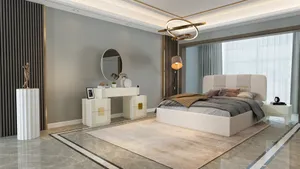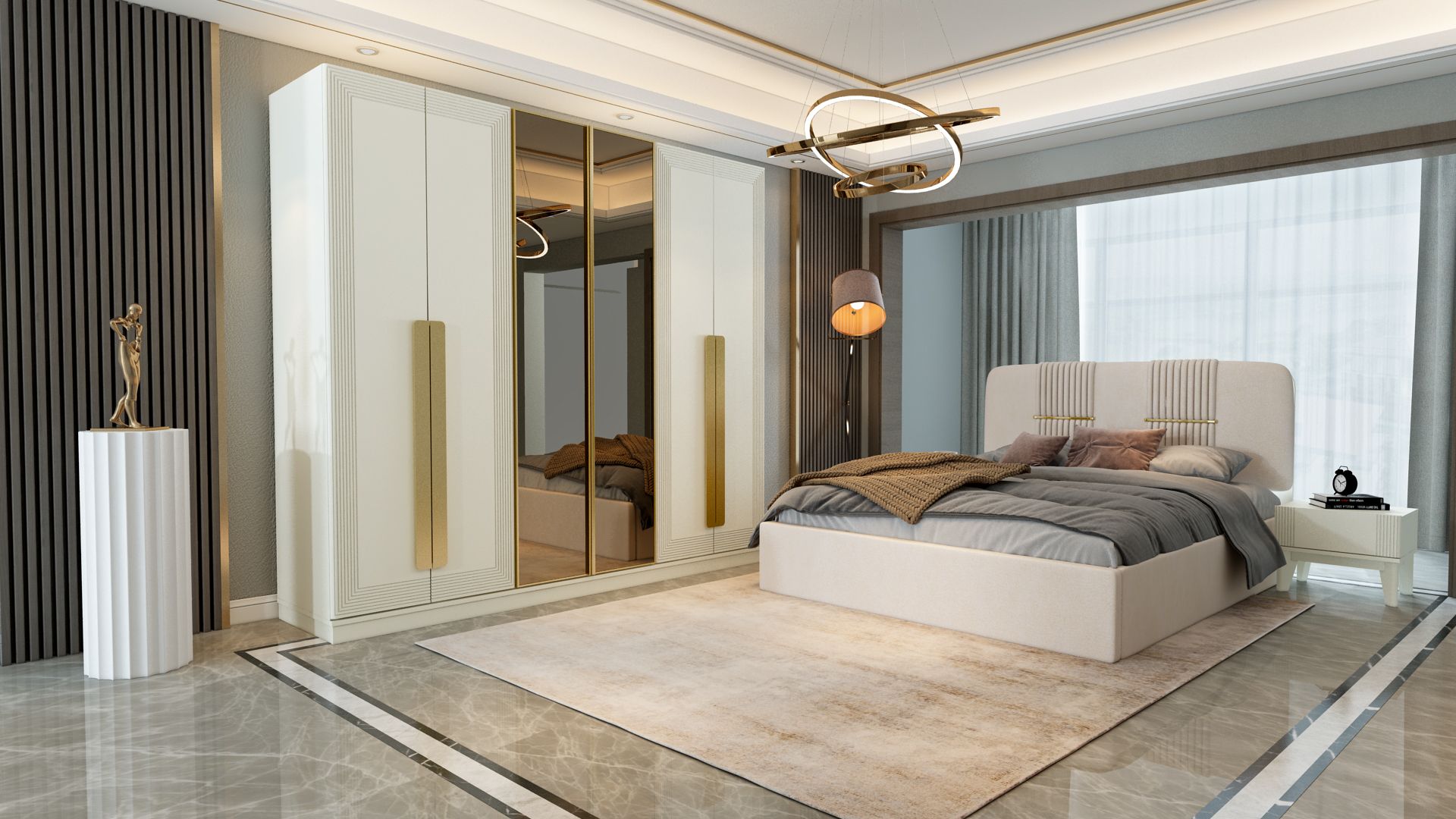 Modern white and gold detailed, stylish wardrobe. Designed with glass doors that add elegance to the space and fine craftsmanship. Made entirely of MDF material.