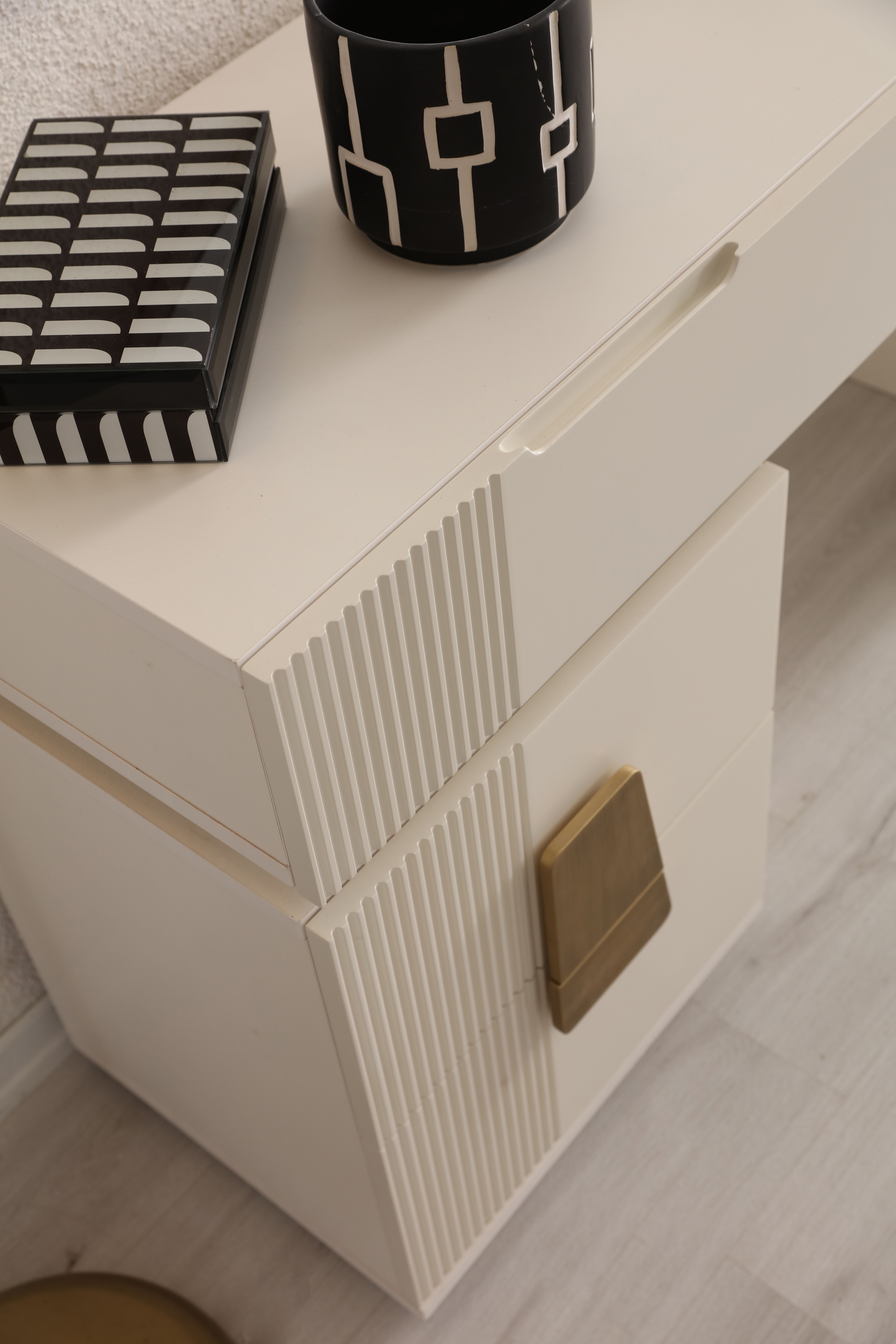 In cream and black tones.