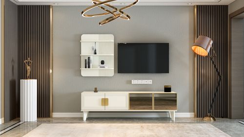 This modern-designed TV unit stands out with its elegant and functional structure. The cabinet section at the bottom and the shelves at the top provide an aesthetic and practical storage solution.